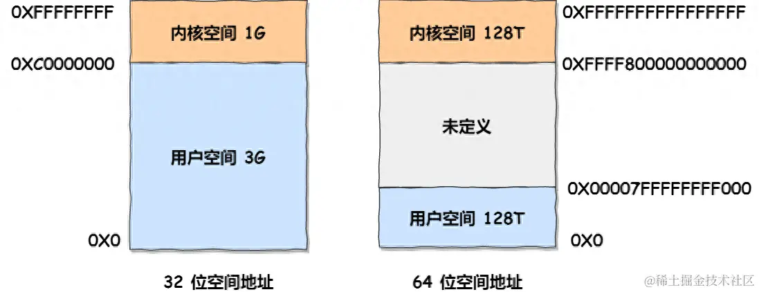 - 64 位系统的内核空间和用户空间都是 128T,分别占据整个内存空间的最高和最低处,剩下的中间部分是未定义的。