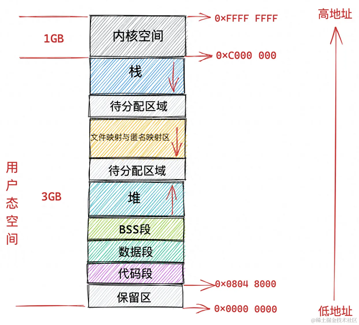 - 0x0000 0000 到 0x0804 8000 这段虚拟内存地址是一段不可访问的保留区,因为在大多数操作系统中,数值比较小的地址通常被认为不是一个合法的地址,这块小地址是不允许访问的。比如在 C 语言中我们通常会将一些无效的指针设置为 NULL,指向这块不允许访问的地址。