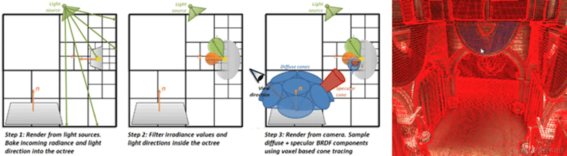 Cone Tracing顾名思义,就是在Trace的时候不再发射射线,而是使用圆锥求交。这种方式可以大大减少需要Trace的射线的数量。Cone Tracing往往和场景的体素化表达结合在一起使用。也有一些别的应用,例如Cone Tracing结合SDF来估算软阴影。