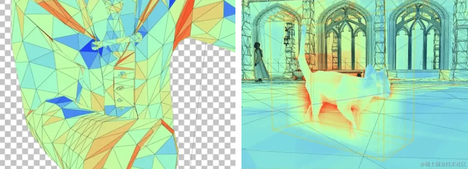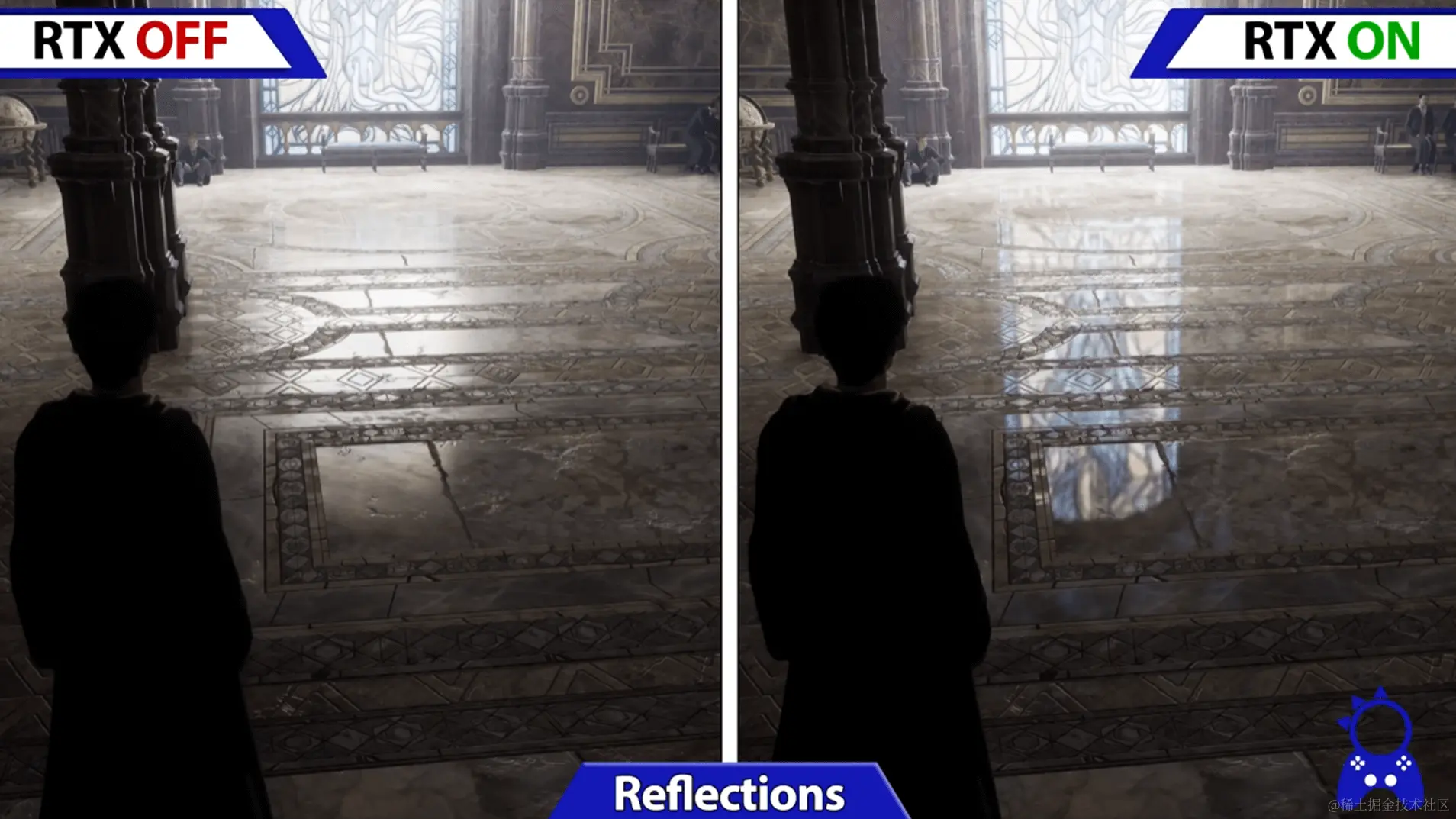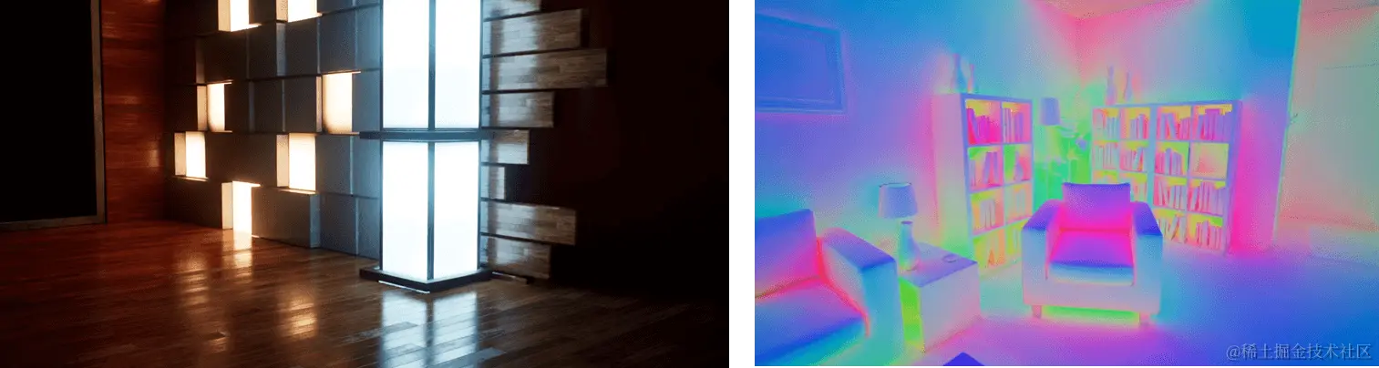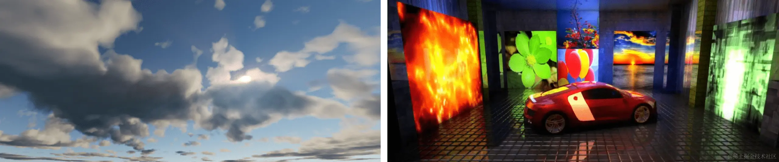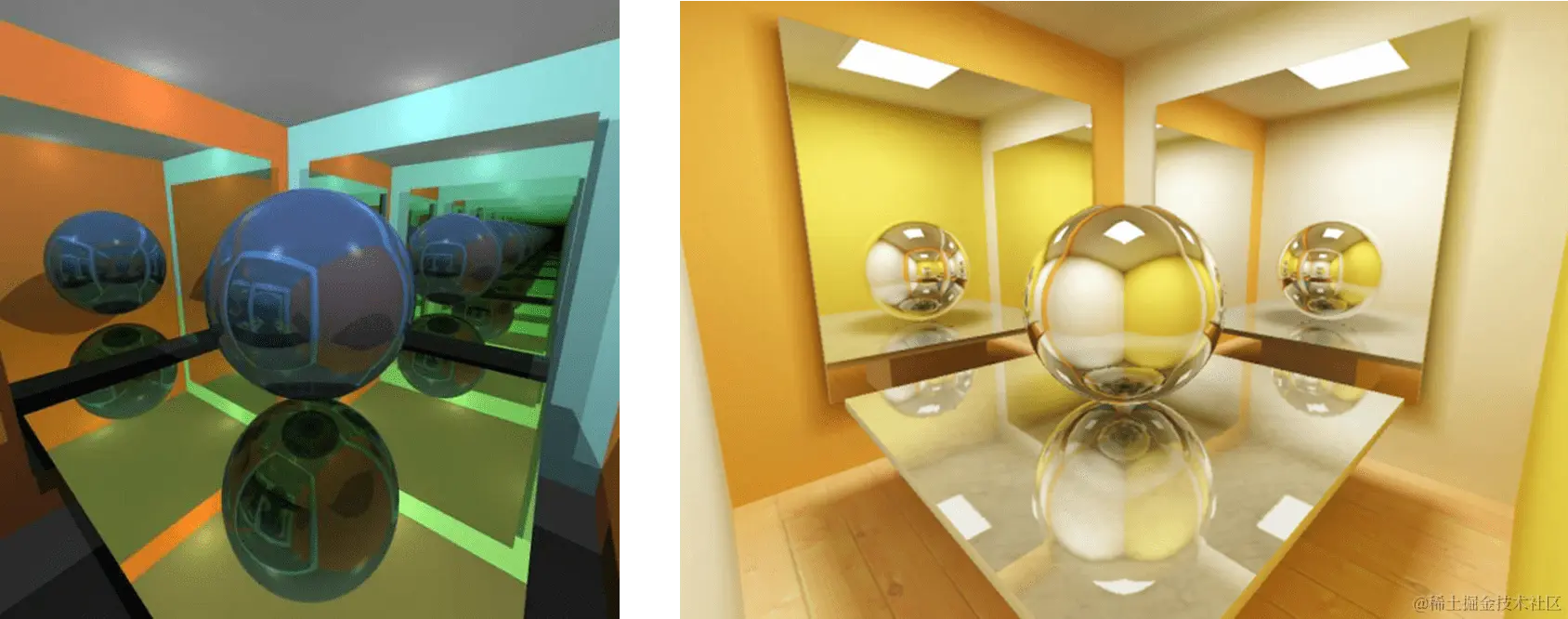 一般大家会觉得左边这个是光栅化管线的结果,右边这个是Raytracing管线的结果。但其实左边这个才是Raytracing的结果,因为里面有一个镜子和镜子之间的无限反射效果,这在光栅化管线中比较难实现。