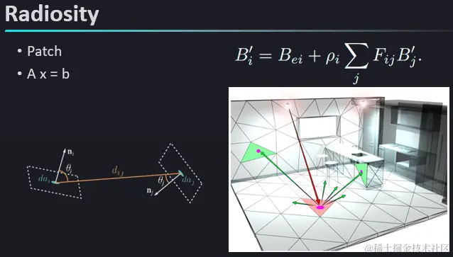 那么GI是不是一定要有Raytracing算法?也不一定,例如经典的Radiosity算法,就是把场景分成多个Patch,然后根据Patch之间的距离和角度预计算一个Patch之间的间接光漫反射的影响关系,然后列一个巨大的方程,通过解这个方程,来计算整个场景的GI结果。