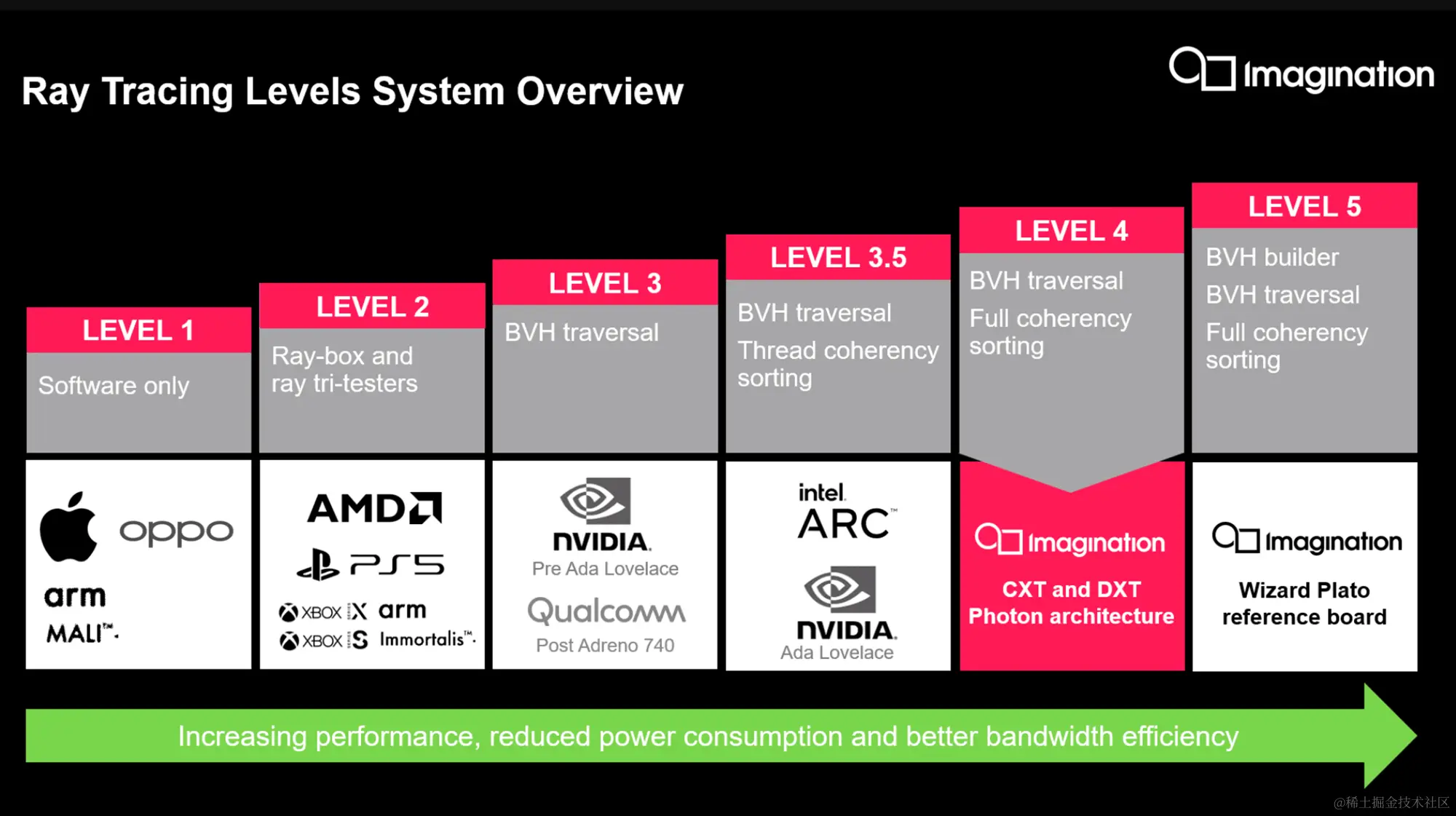 Imagination认为,Level1就是基于软件实现硬件光追,一般没有设计专门针对Raytracing计算加速的硬件,例如苹果和Mali就是Level1。假如你在硬件设计上针对光线和Box以及光线和三角形求交有专门的加速,那么你就达到了Level2,例如AMD。假如你对BVH的管理和遍历过程有硬件加速,那么你就达到了Level3,例如RTX 30系列。假如你对BVH的遍历和线程一致性排序解决的比较好,那么你就达到了Level3.5,例如RTX 40系列。