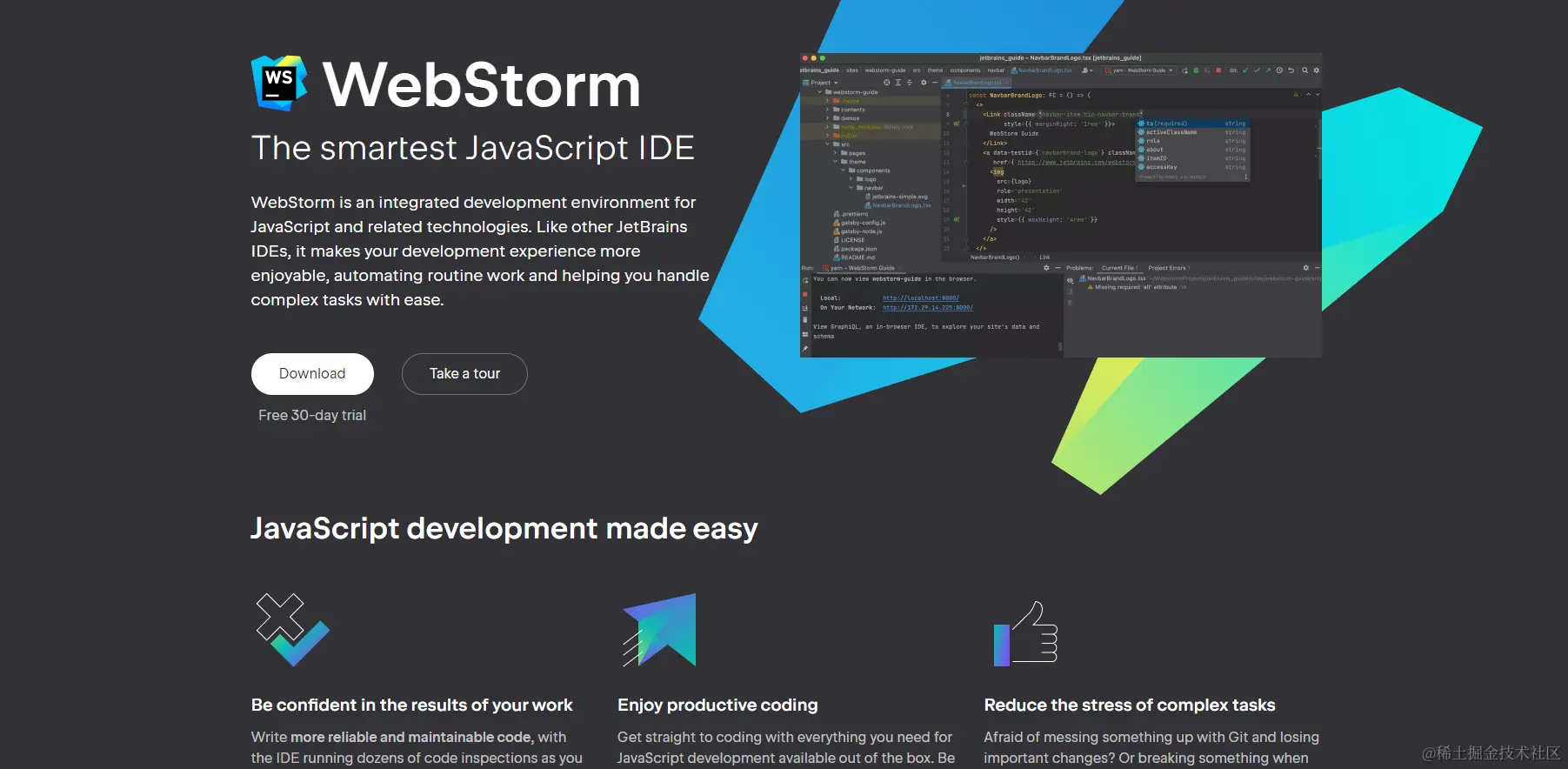 WebStorm,最智能的 JavaScript IDE 工具,是一个用于 JavaScript 和相关技术的集成开发环境。与 JetBrains 推出的其他 IDE 一样,它使你的开发体验更加愉快,使日常工作自动化,并帮助你轻松处理复杂的任务。
