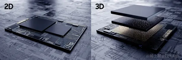 2.5D 封装是指把多块芯片安装在同一块硅中介层上,再把硅中介层安装到 PCB 基板上,然后再把它们整体封装到一起,形成一块完整的集成芯片。这个硅中介层可以理解为一块精密的电路芯片,里面布置了密集的电信号传输通道,芯片之间通过这个硅中介层形成非常高密度的信息连接,从而减少了信号传输的延迟和功耗。由于加上了这块硅中介层,所以这个封装方法称为 2.5D封装,就像下图中的左边部分示意。再来说 3D封装,在 2.5D封装的基础上,去掉硅中介层,直接把每块芯片堆叠到一起,这样的话传输路径会更短体积也会更加小。这其实就是 3D 封装,也就是下图中的右侧部分示意。3D 封装对工艺的要求更加苛刻,不过现在已经越来越多的 CPU、GPU 和 存储芯片开始采用 3D 封装,比如海力士的 HBM 存储芯片,就是通过 3D 封装的堆叠来实现了更大的传输带宽。
