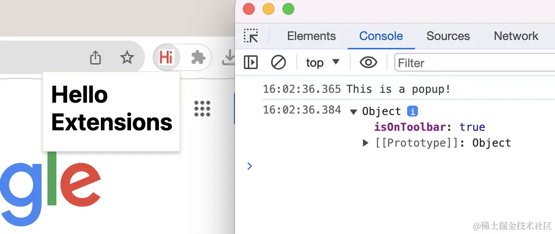 在这个弹窗上面右击,选择「检查」打开插件控制台,可以看到 popup.js 代码的执行结果: