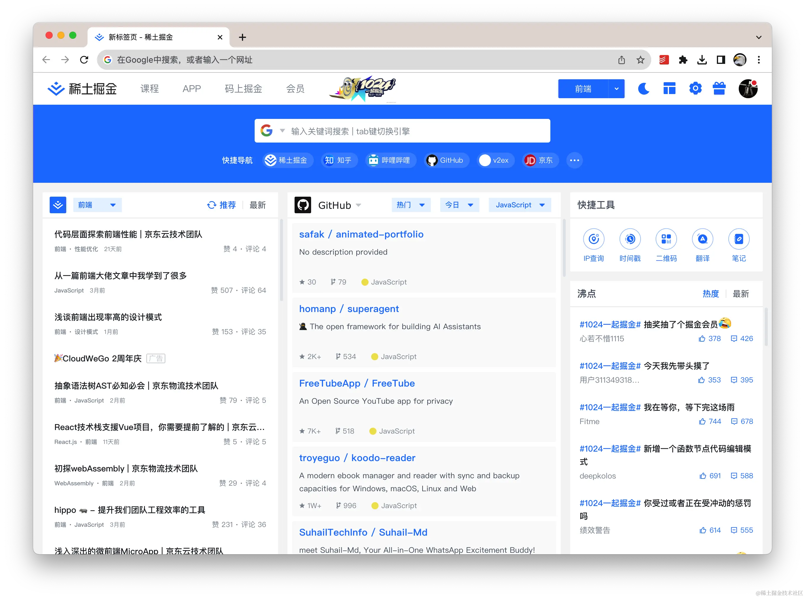 当用户打开新标签页的时候,会默认打开掘金的聚合页面,内容包括热点文章、 GitHub trends 和快捷工具等。