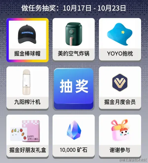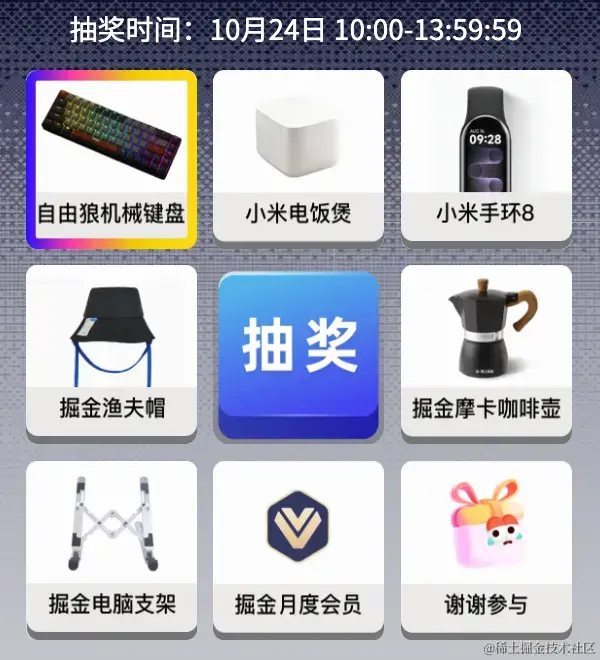 ⏰ 10月24日10点,14点,18点登录掘金即可参与三轮抽奖,每轮抽奖开放4小时,快快设好闹钟!