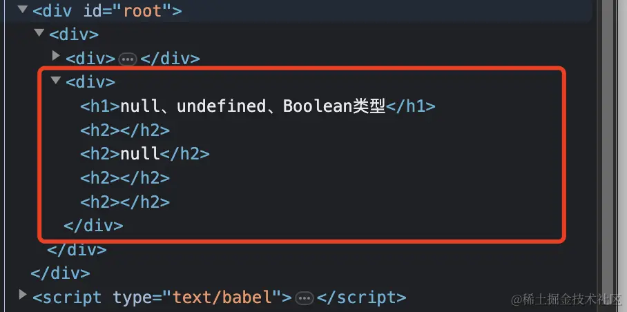 对应的div结构如下,可以看到通过空字符串拼接处理后的h2标签可以正常显示null,其余则直接为空