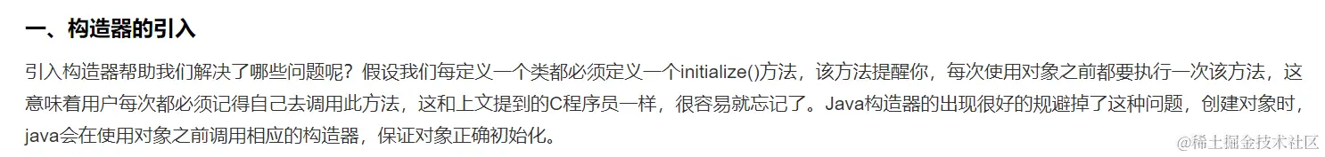 这么看来,初始化是必要的,这就跟各种教材以及文章的解释接上了,如果我们需要手动初始化,就需要为每一个类编写一个初始化的方法,并且需要手动调用这个初始化方法,但是这样人们很容易忘记调用,那么就会出问题。这个时候,Java就引入了构造器的概念,使得创建对象时会自动调用它。