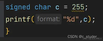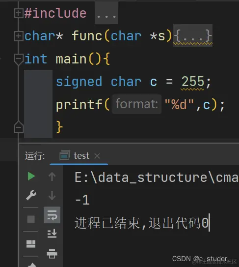 c语言符号数的转换(signed和unsigned) 也无风雨也雾晴 2023-10-17 87 阅读1分钟 编辑 定义有符号数c的值为255,char类型在内存中占一个字节(8位)的内存空间 将其转换为二进制展开为 11111111 因为c为有符号数,最高位为1, 如果为无符号数则为01111111 有符号数最高位为1,无符号数最高位为0 c是有符号数,最高为的二进制数为-256,其余为为255,相加,c的十进制整数就为-1 编辑