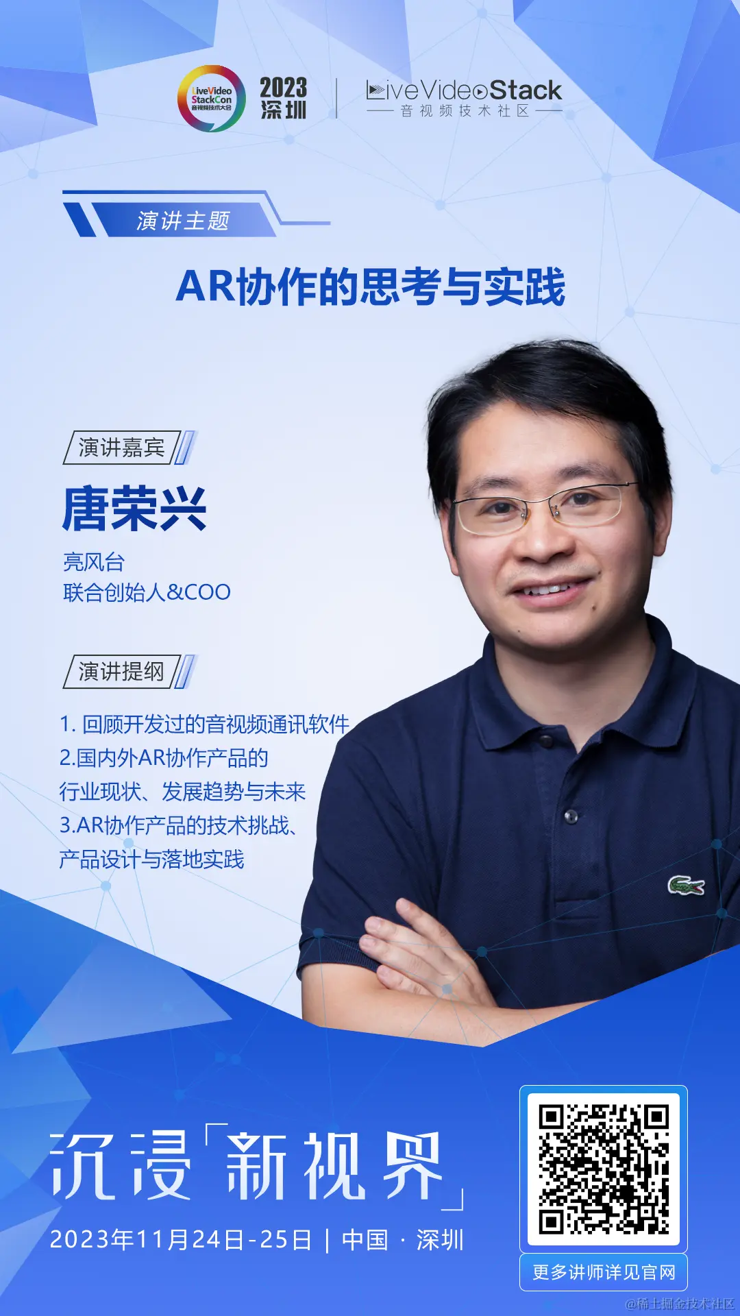感谢唐荣兴老师接受我们的采访,分享他在AR通讯协作领域沉淀的经验与思考。如果你想更近一步地了解AR通讯协作的技术挑战与产品设计等前沿知识,与唐老师面对面交流通讯协作未来的模样,欢迎各位LiveVideoStack 的用户到深圳站大会现场进行体验。
