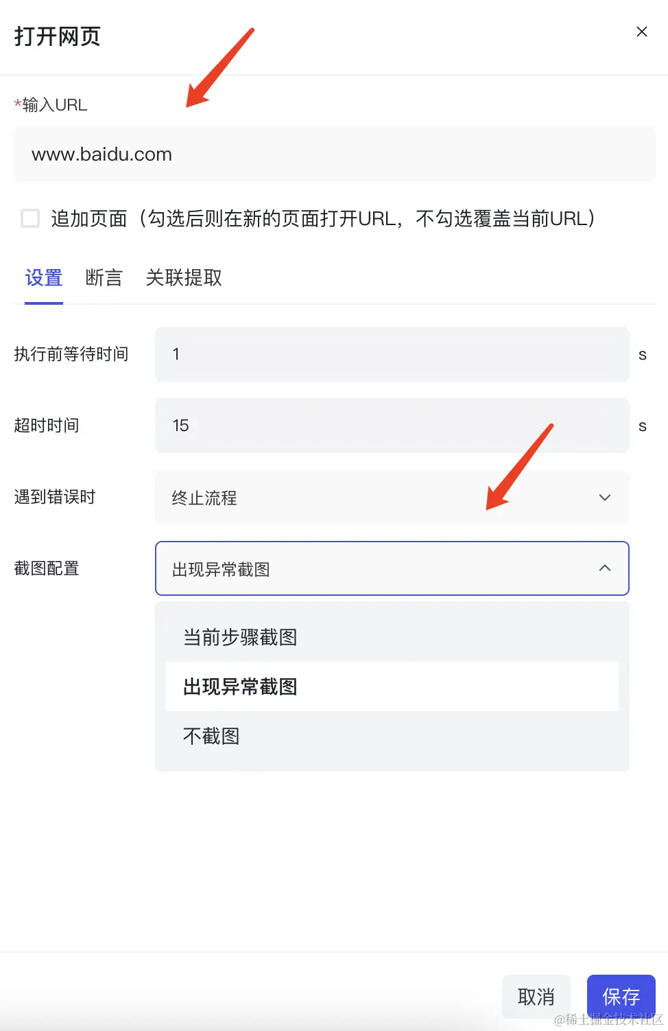 在弹框内输入需要打开的网页,配置当前步骤截图,点击保存。