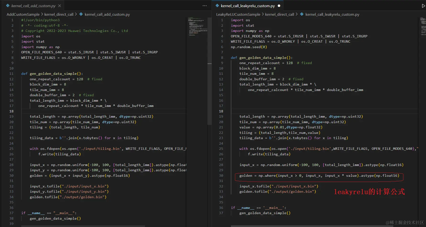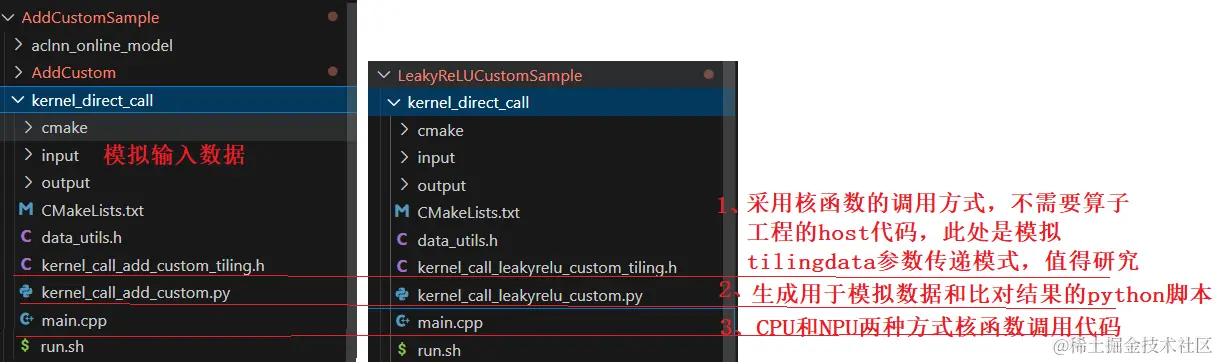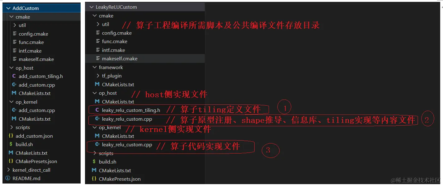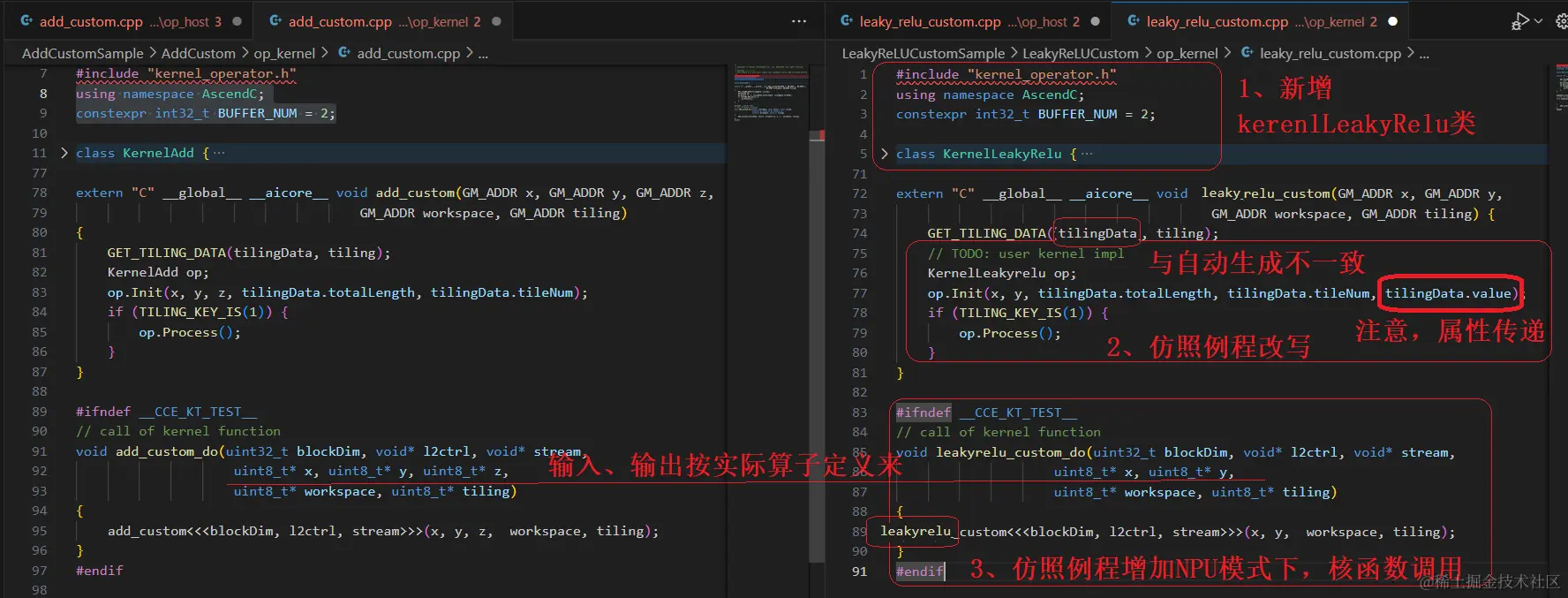 如下图所示:左侧是Add例程,右侧是参考例程写出的“LeakyReluCustom”。红色的是有差异的地方,请记住这些或者等我们完成代码编写后再回头看一下这儿,会发现所做的修改都和此处有关系。