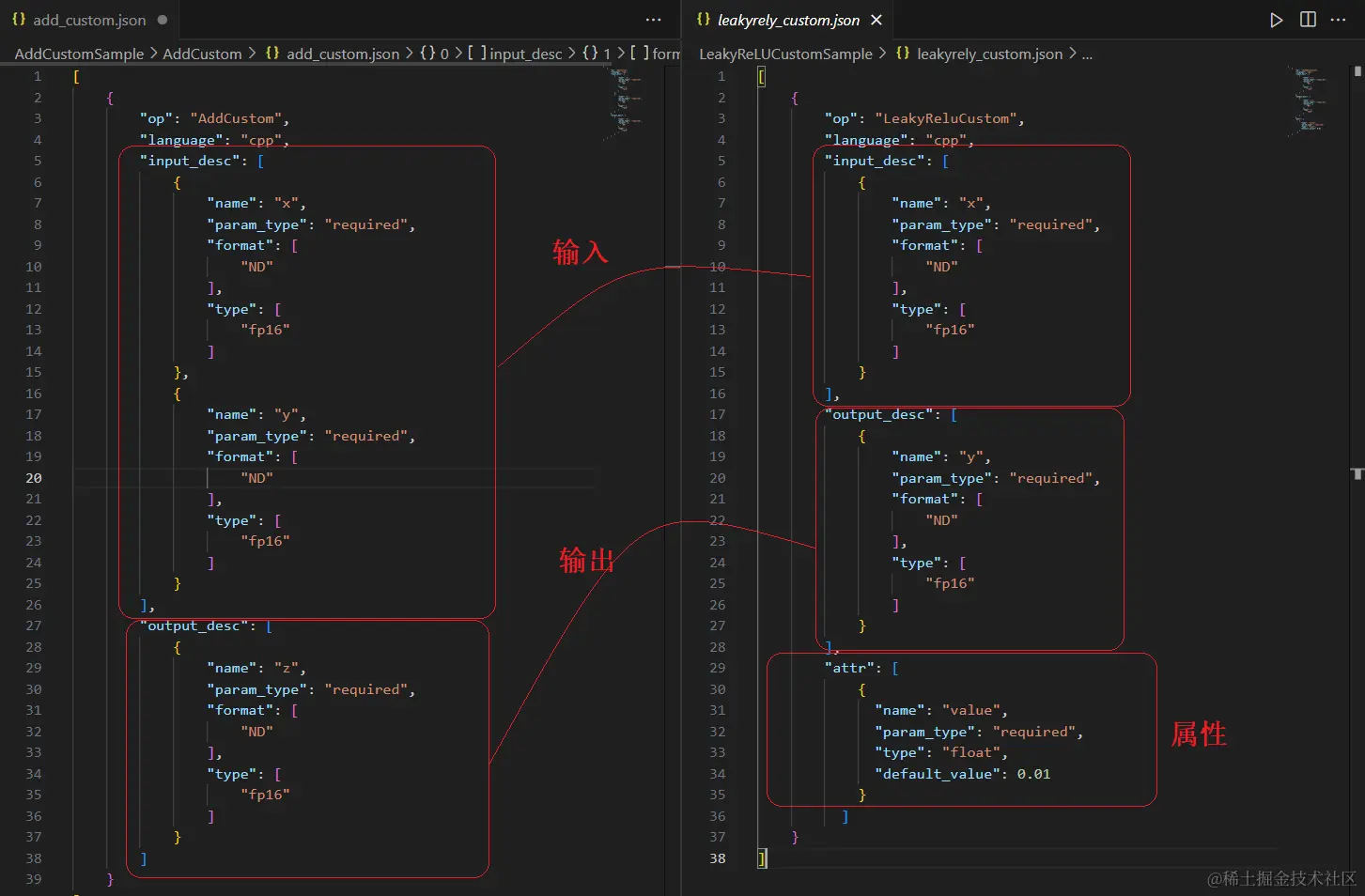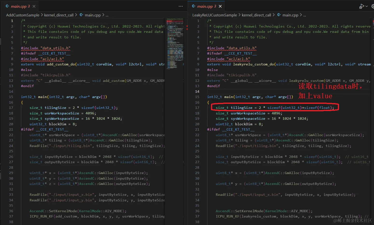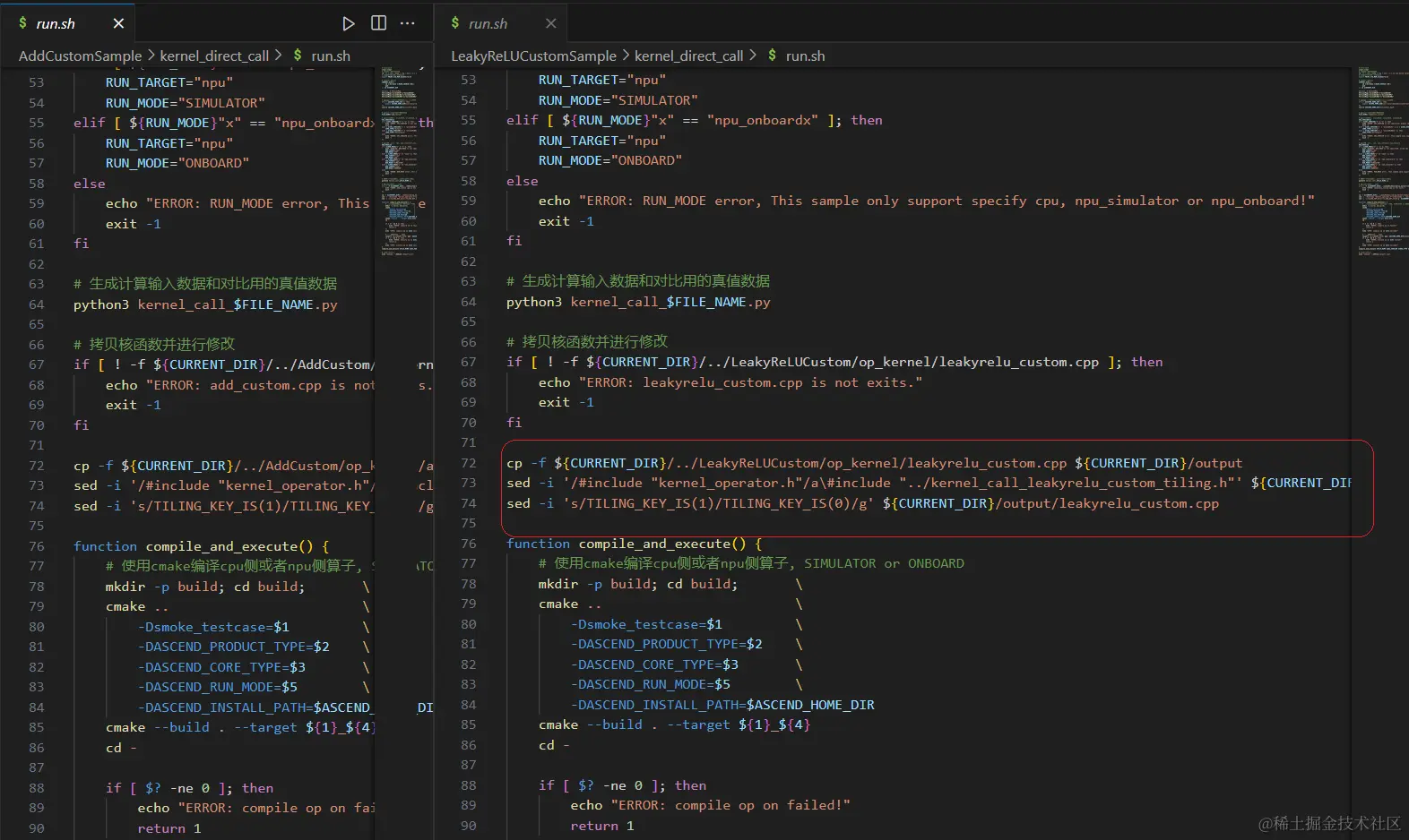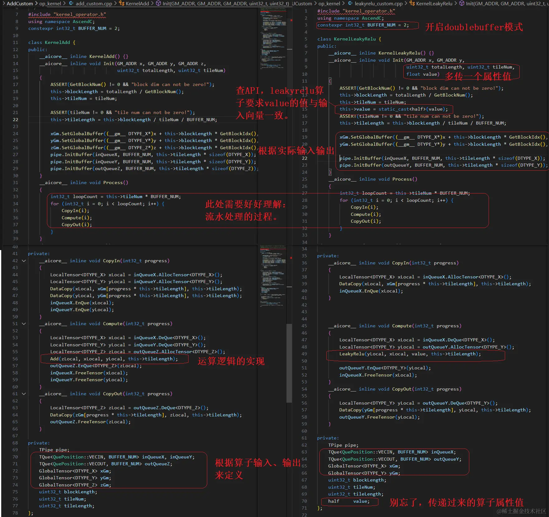 如下图所示:左侧是Add例程,右侧是参考例程写出的“LeakyReluCustom”。红色的是有差异的地方,请记住这些或者等我们完成代码编写后再回头看一下这儿,会发现所做的修改都和此处有关系。