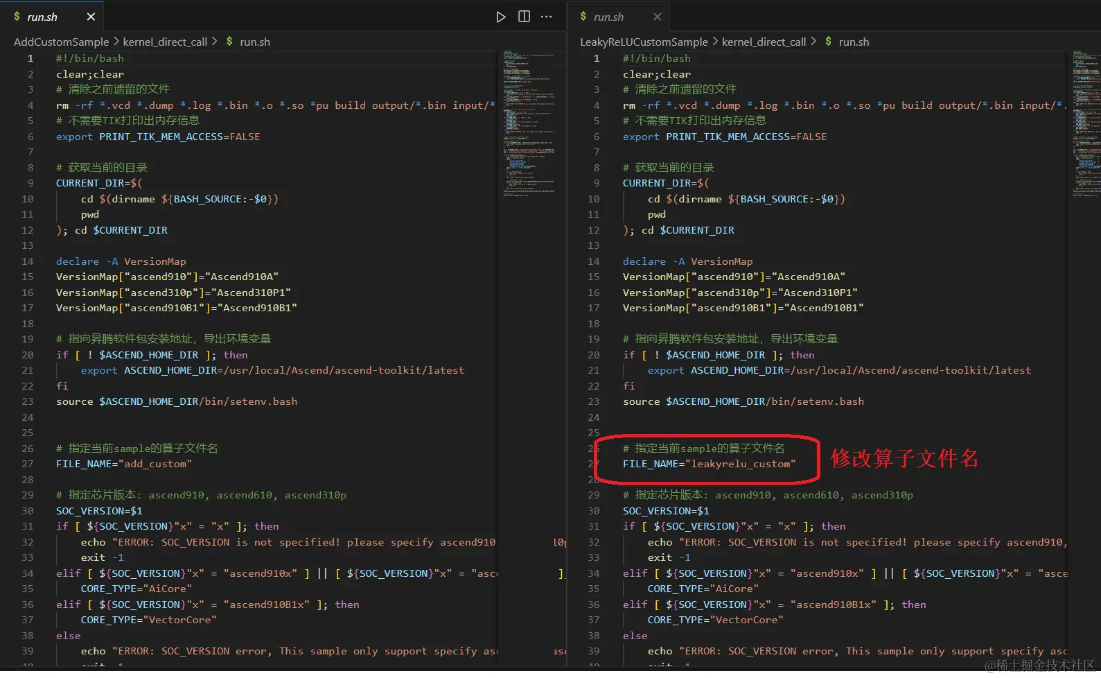 需要将算子工程op_kernel的算子实现代码拷贝到核函数调用工程里,需要对路径名和文件名做相应修改。run.sh其余部分无需修改,它是通过比较kernle_call_leakyrelu_custom.py和AscendC算子对相同数据的计算结果的md5sum,来判断结果是否一致的。