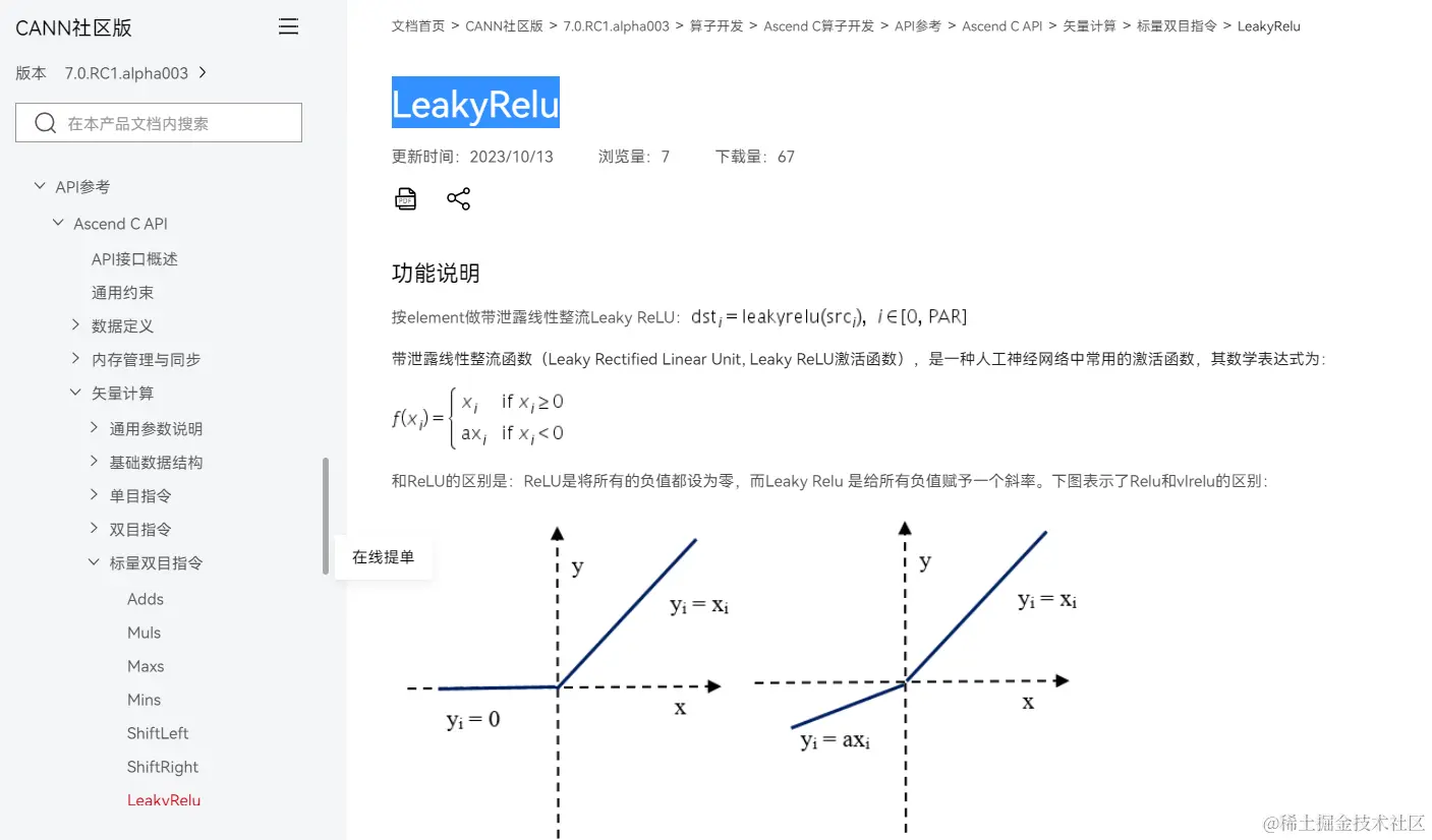 2)分析计算实现的方法,查找AscendC官方文档,在标量双目指令中有LeakyRelu算子,本例可以直接使用。对没有直接API实现的算子,需要先分解成基本API的组合。