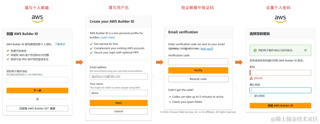 在首次访问时,需要填写个人邮箱以及用户名,然后经过发送给邮箱的验证码验证之后,填写个人密码即可完成 Amazon Builder ID 的注册。