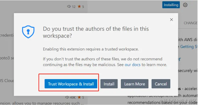 点击 install 之后,选择弹出窗口中的 Trust Workspace & Install 选项: