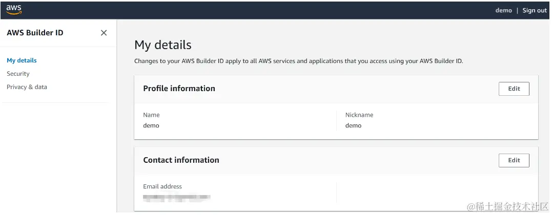 注册之后,登录到 Amazon Builder ID 中就可以看到如下的界面显示个人的信息: