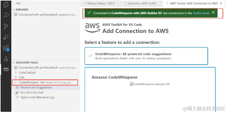 点击 Yes 后,完成 Amazon Builder ID 的验证并连接到 CodeWhisperer 中: