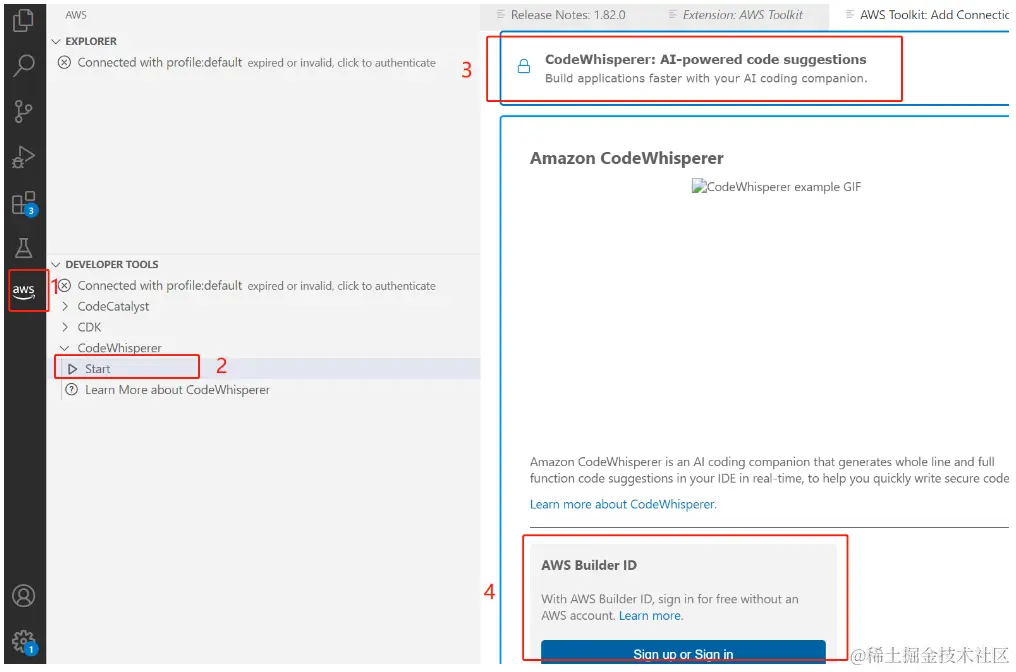安装完成后,在 VS Code 左侧栏中会显示亚马逊云科技图标栏,我们点击 CodeWhisperer 下的 Start,并选择 CodeWhisperer 下的 Amazon Builder ID