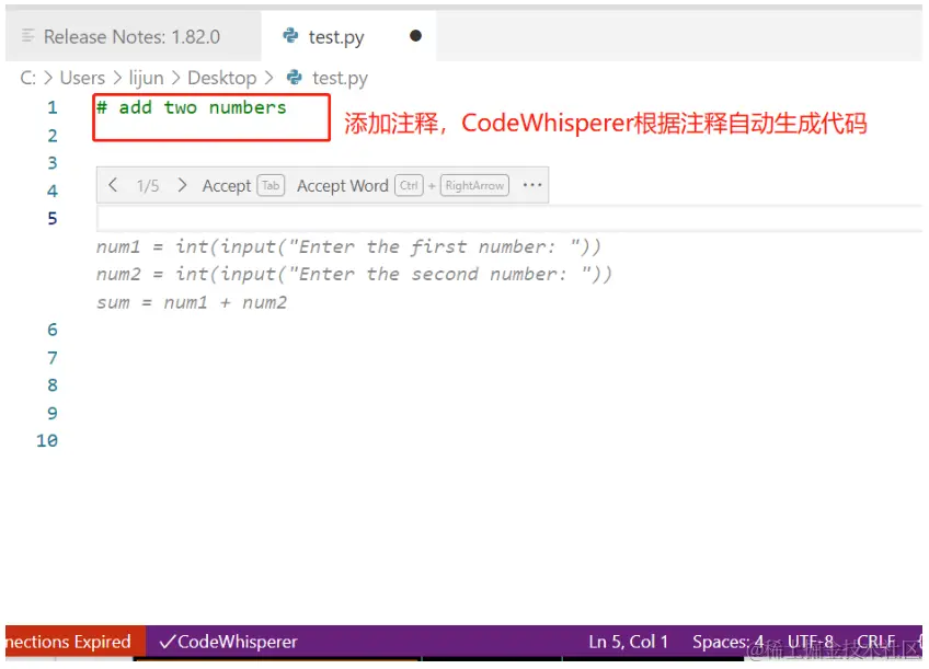 测试 CodeWhisperer 我们在 VS Code 中编写一些代码注释,CodeWhisperer 会根据我们所提示的注释来生成相应的代码