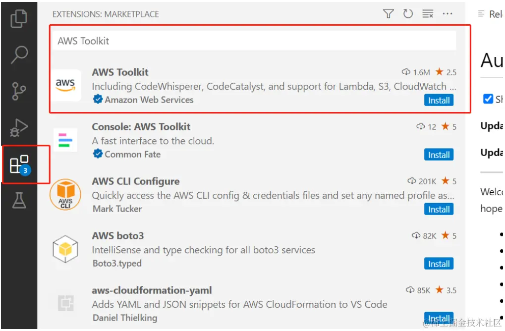 完成 Amazon Builder ID 注册后,我们打开 VS Code IDE 环境,选择左侧栏中的扩展栏,并搜索 Amazon Toolkit 并安装