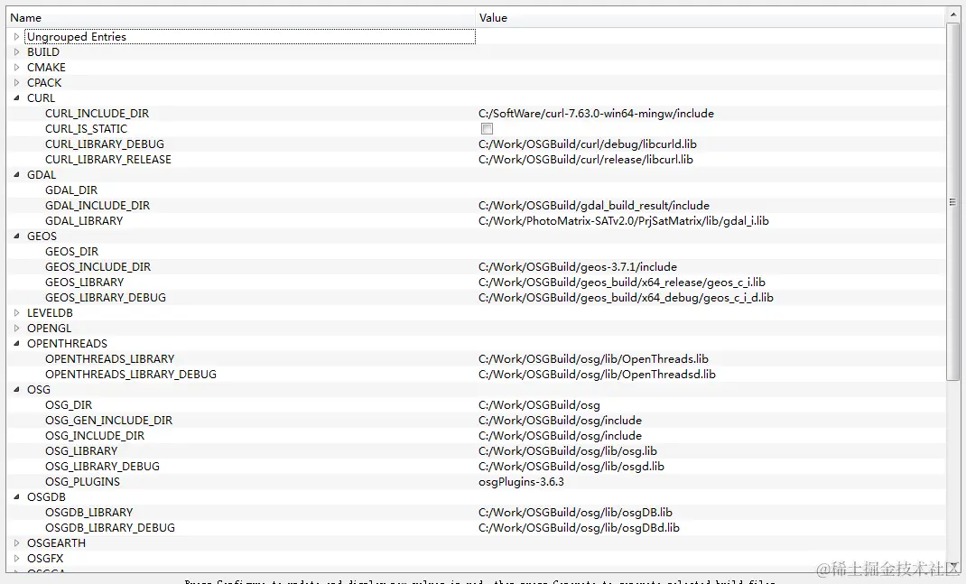 第一次配置一般是不成功的,会提示缺少依赖库。这个时候可以把依赖的路径依次填入,重新“Configure”就可以了。我这边的填写的路径参考如下: