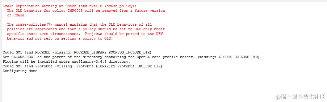 配置过程可以边填写边“Configure”,直到最后不再提示缺少相应的依赖库。如下图所示,提示“configuring done”(提示的警告和缺失组件不是必须)。