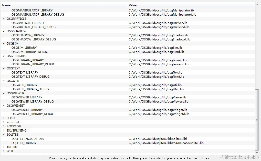 OSG有非常多的子类库,所以如果自己一个个填写的话非常麻烦。这里有个快速办法,首先按照如下图方式组织文件夹C,将头文件都放入到include子文件中,lib文件放入到lib子文件夹里面(debug和release都可以)。然后填写文件夹C到OSG_DIR编译项,最后再次“Configure”,就可以帮你自动识别了相关的路径了。
