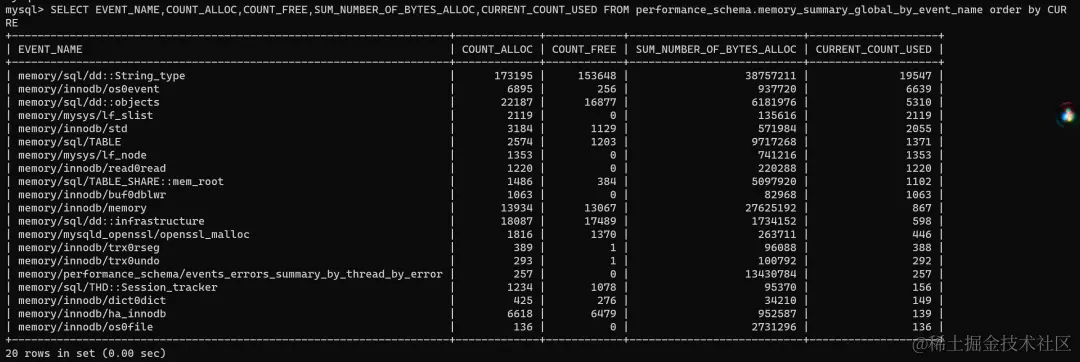我们可以从performance_schema.memory_summary_global_by_event_name表中获取MySQL的总体内存使用情况。