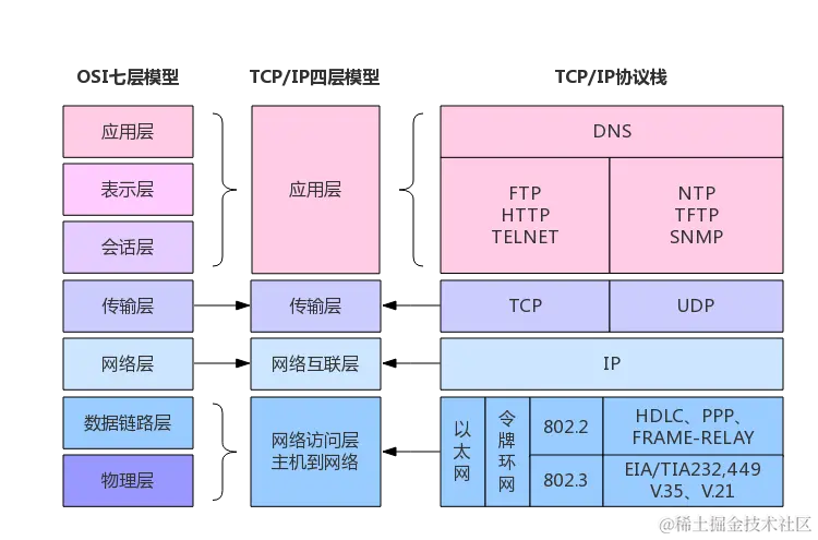 - 应用层:应用程序间沟通的层,如简单邮件传输协议 (SMTP)、文件传输协议 (FTP)、远程网络访问协议 (Telnet) 等。