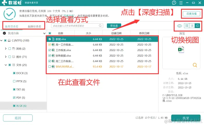 3.快速扫描完成之后,所选磁盘内的部分文件将被扫描到,选择需要恢复的文件,若没有,点击【深度扫描】 ;