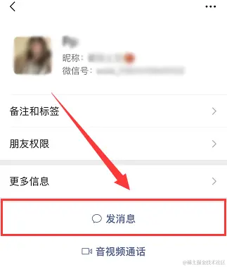 步骤2:点击好友头像后会进入对方的资料页面,然后点击【发消息】给好友发送信息。发送之后返回聊天主界面就可以看到该聊天窗口了。