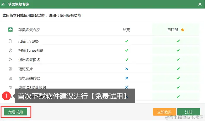 步骤2:首次下载建议大家先进行免费试用,然后用数据线将手机和电脑连接起来。