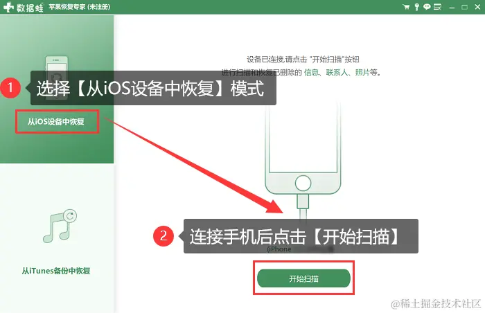 步骤3:选择【从iOS设备中恢复】后单击【开始扫描】,然后请耐心等待数据扫描结束。