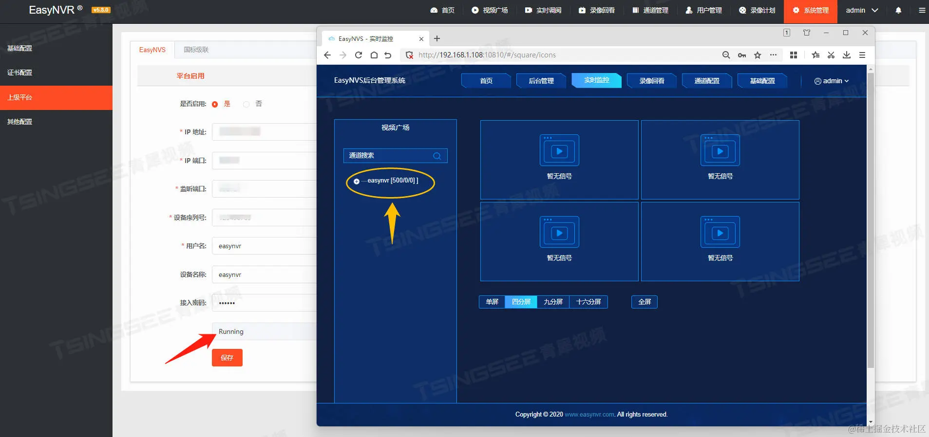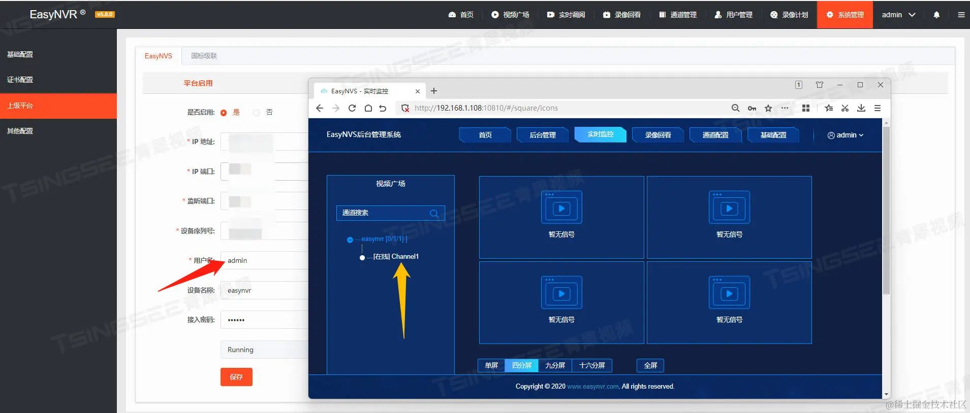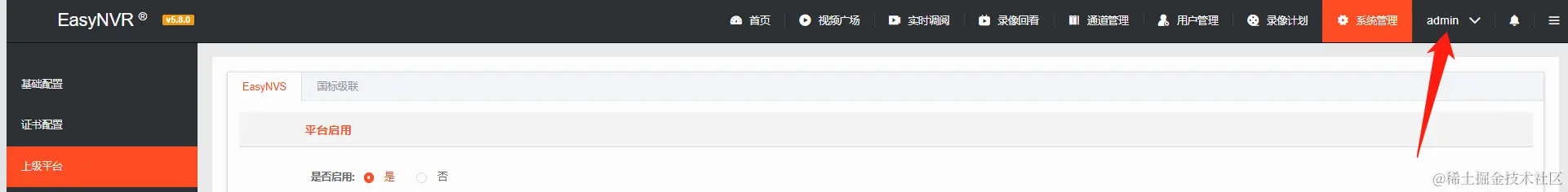 注意:在级联EasyNVS平台时,EasyNVR中的用户名一栏应配置为管理员名称,因此这里应该配置为admin,修改后EasyNVS就能正常显示通道了。