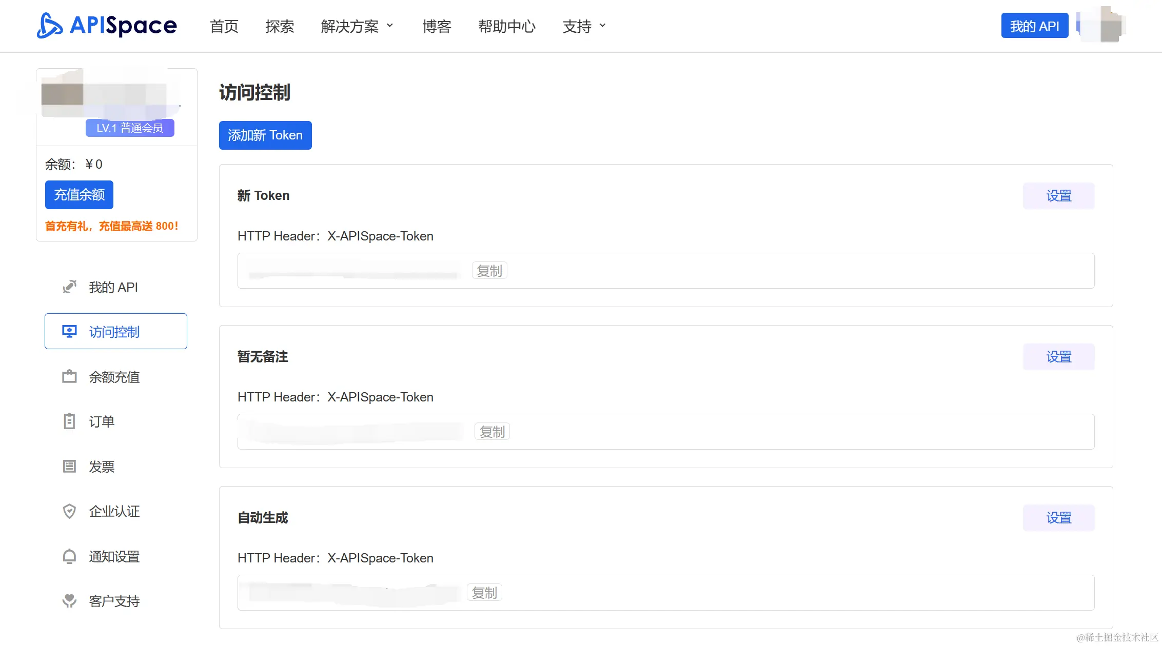 注册成功后,我们在页面导航菜单点击 【我的 API】进入 【访问控制】页面,即可看到平台提供的密钥。