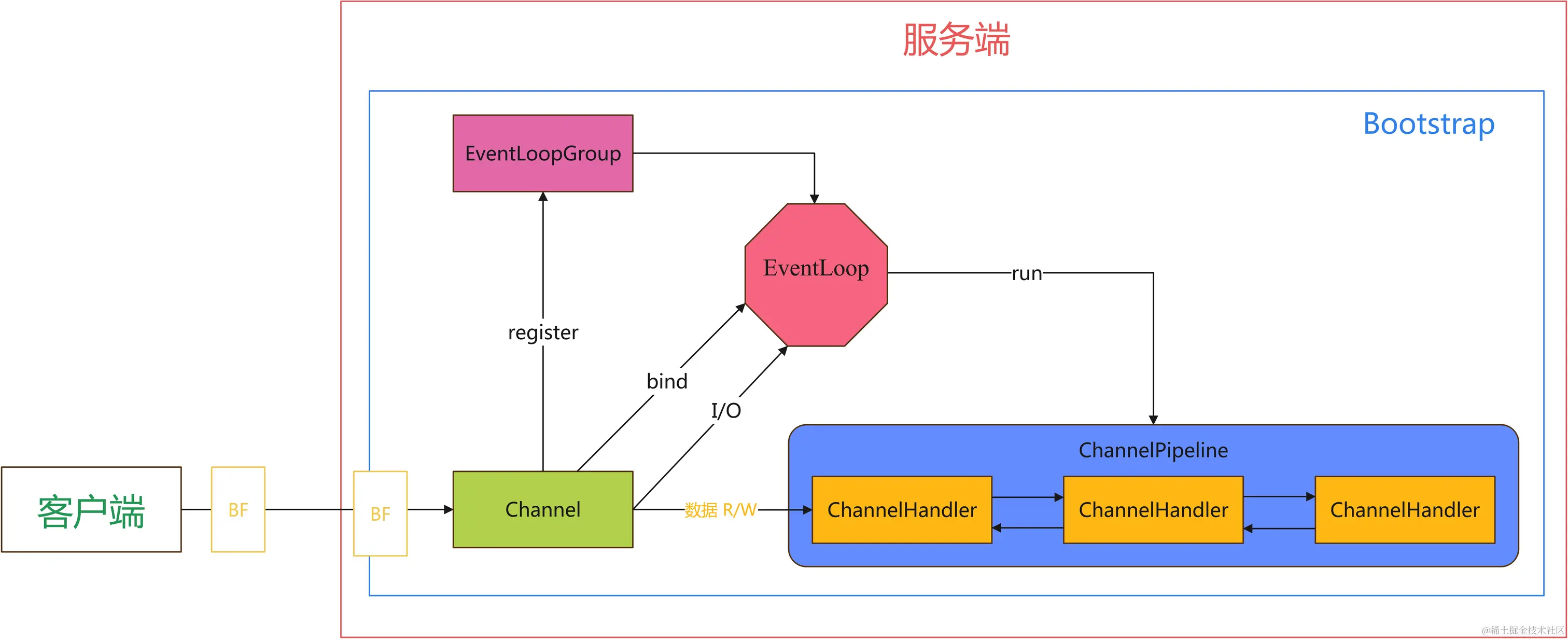 - 服务端在启动时,绑定本地端口,会初始化两个 EventLoopGroup,一个 BossEventLoopGroup 和 WorkEventLoopGroup ,其中 BossEventLoopGroup 专门负责接受客户端的连接(Accept 事件),WorkEventLoopGroup 专门负责网络读写。