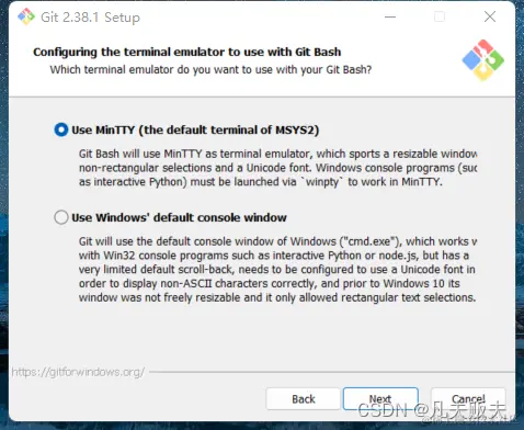 选择Git Bash使用的终端模拟器,一般默认即可,点击“Next”进入下个页面;