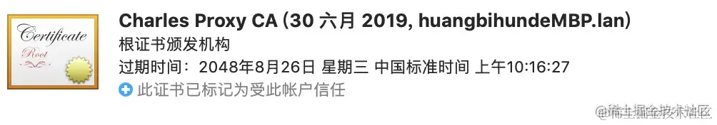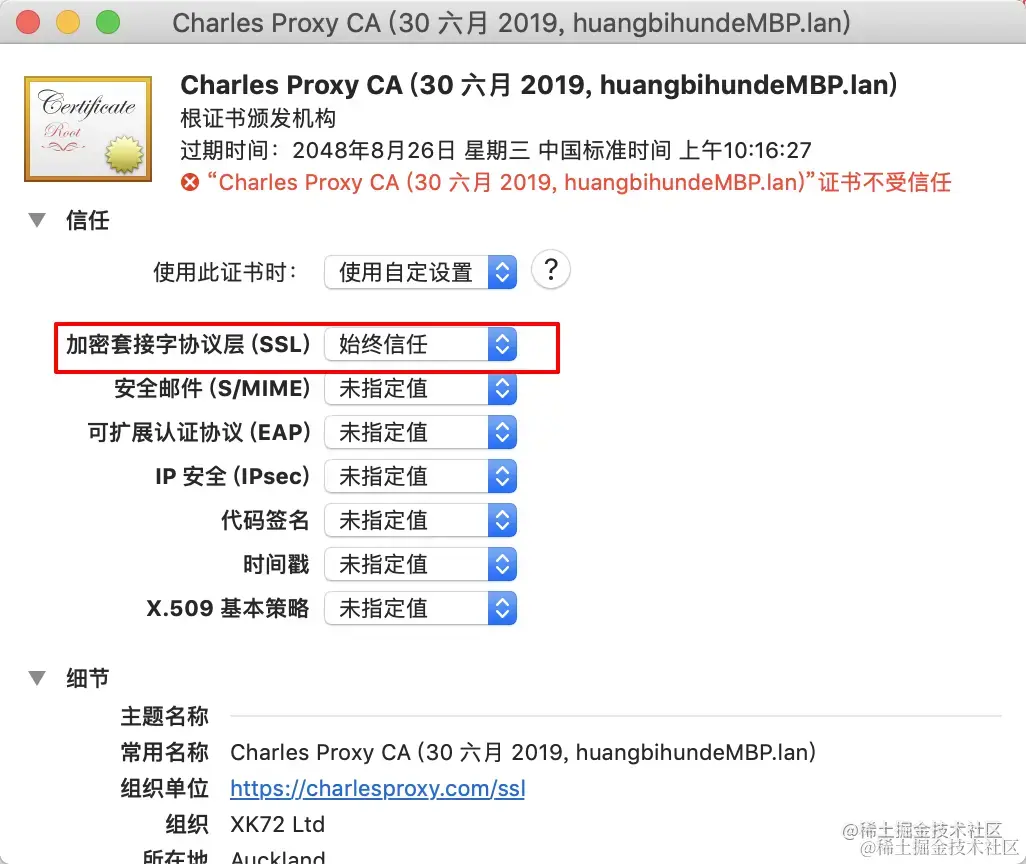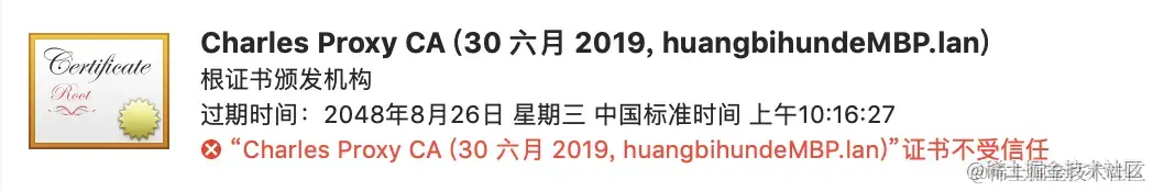 将证书添加到钥匙串之后,可以看到证书是不受信任的