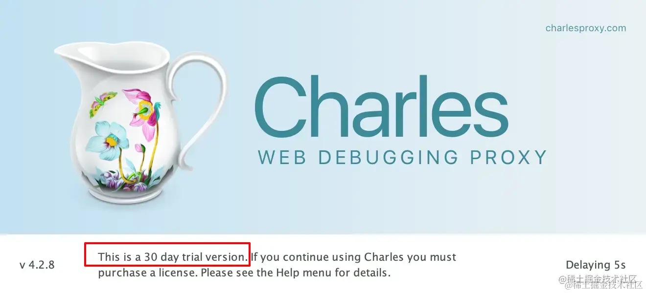 Charles是收费的,打开时会有30天使用权限的提示,如图: