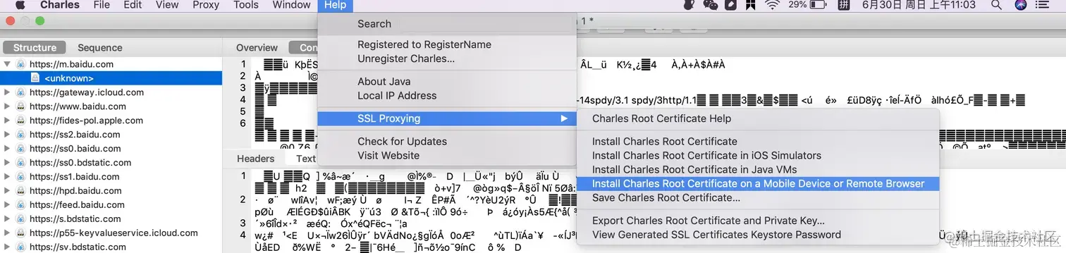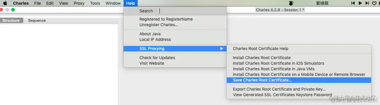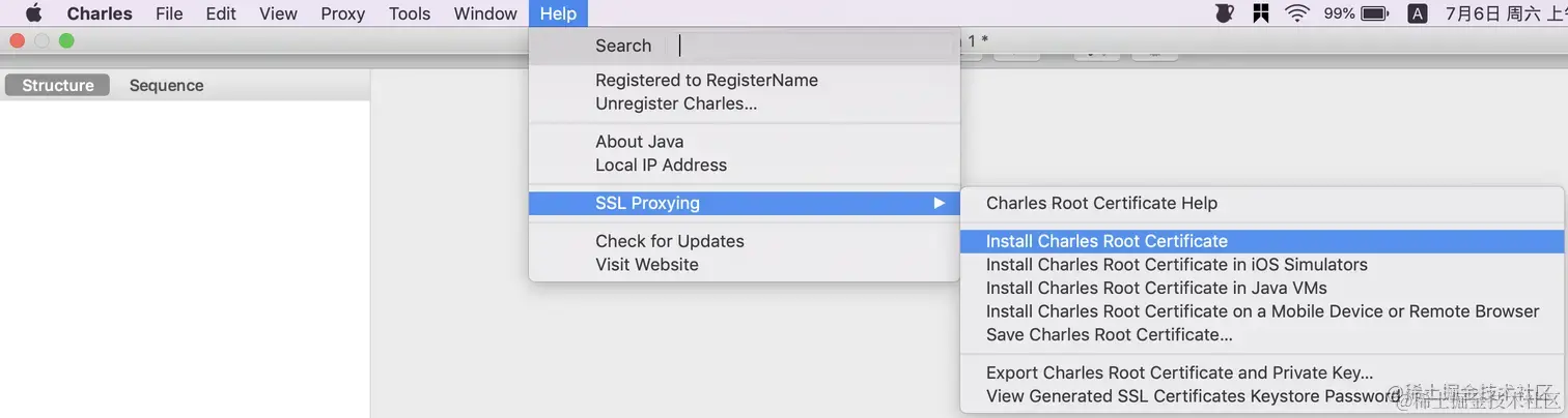 在菜单栏选择 『Help -> SSL Proxying -> Install Charles Root Certificate』,会自动导入 Charles Proxy CA 证书。