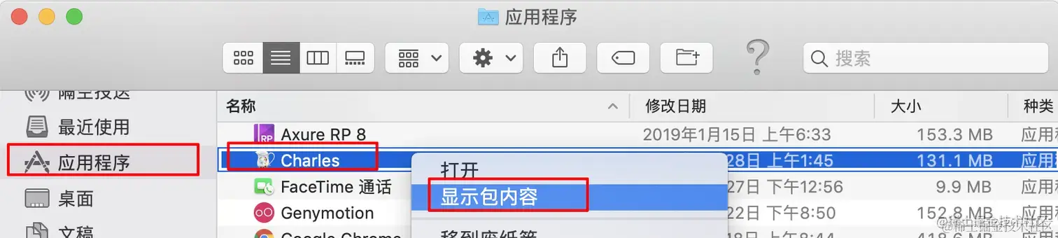 替换步骤如下:打开应用程序 -> 选择Charles -> 显示包内容