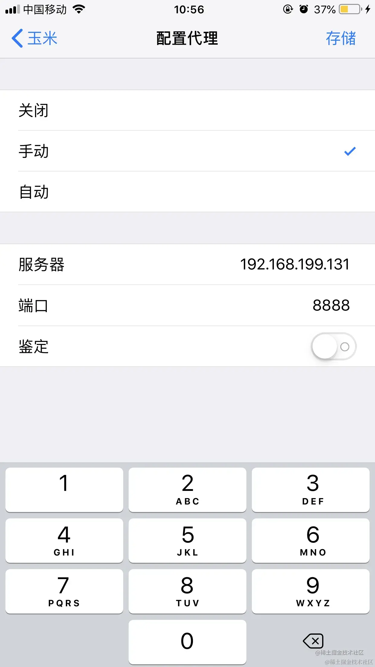 - iOS设备上,设置连接wifi的代理服务器,服务器填上一步中获得的IP,即192.168.199.131,端口填8888: