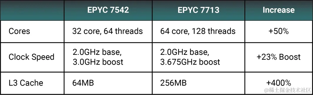 时钟速度提升 23% 意味着可以适应更高工作负载的需求。更高的核心数减少了在单个执行引擎上运行的指令可能的资源争用和瓶颈。