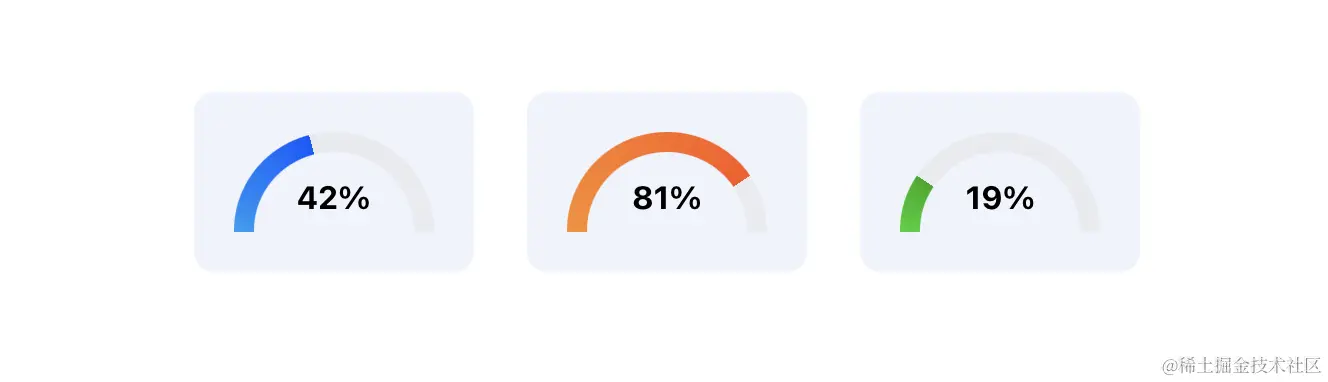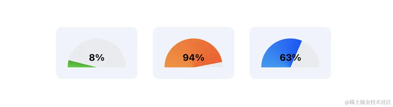 - 半圆形进度条,中间是进度数字,圆弧渐变背景表示进度,从 0% 到 100%