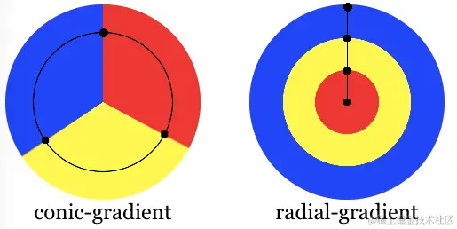 注意,cornic-gradient 的效果和 radical-gradient 是不一样的,容易搞混淆。前者是从圆心向任意方向射出的直线上的颜色都一样,而后者是跟圆心距离相同的圆环上的颜色都一样: