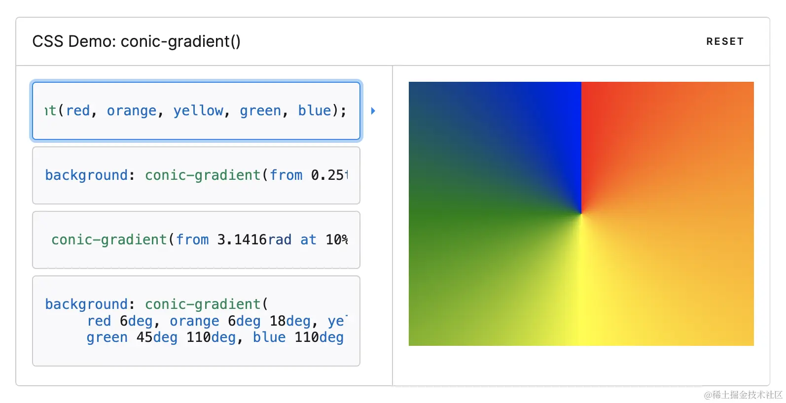 得到的效果就是以圆心为中心,向四周扩散的渐变效果,大家可以在 MDN 文档中进行体验: