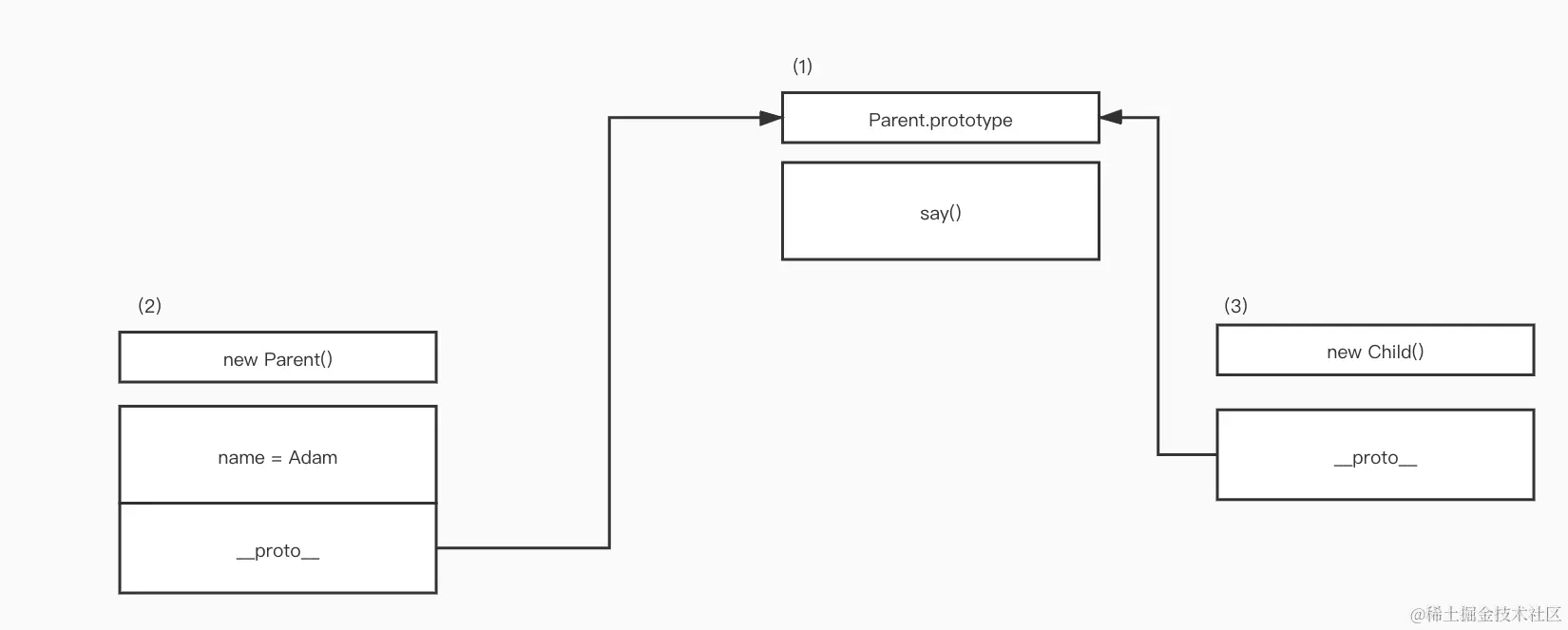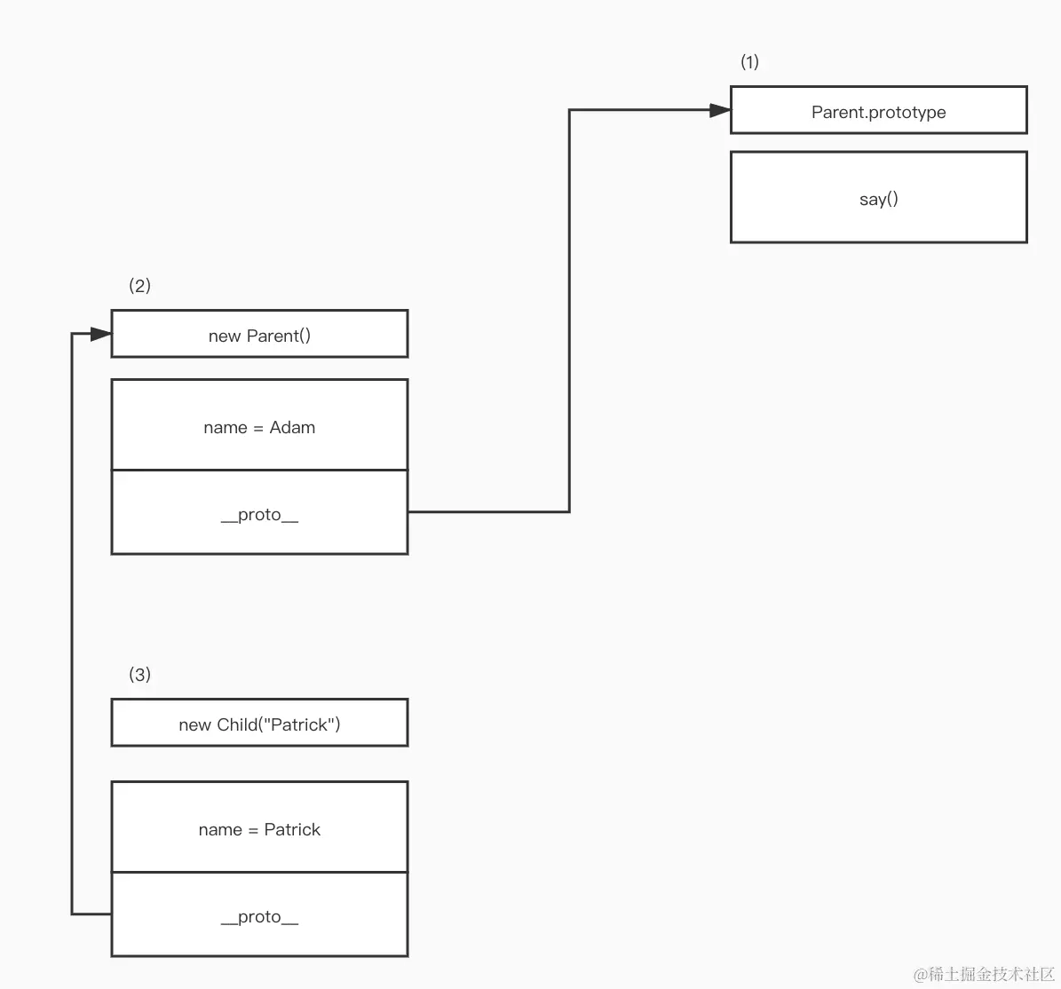 如果访问kid.name,其结果将是undefined类型。在这种情况下,name是父对象所拥有的一个属性,然而在继承的时候我们实际上从未调用过new Parent(),因此也从未创建过该属性。当您访问kid.say()时,在对象#3中该方法并不可用,因此需要开始查询原型链。然而对象#4中也没有该方法,但是对象#1中确实存在该方法并且位于内存中的同一个位置,因此所有继承了Parent()的不同构造函数,以及所有由其子构造函数所创建的对象都可重用该say()方法。